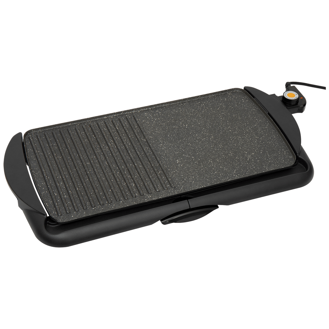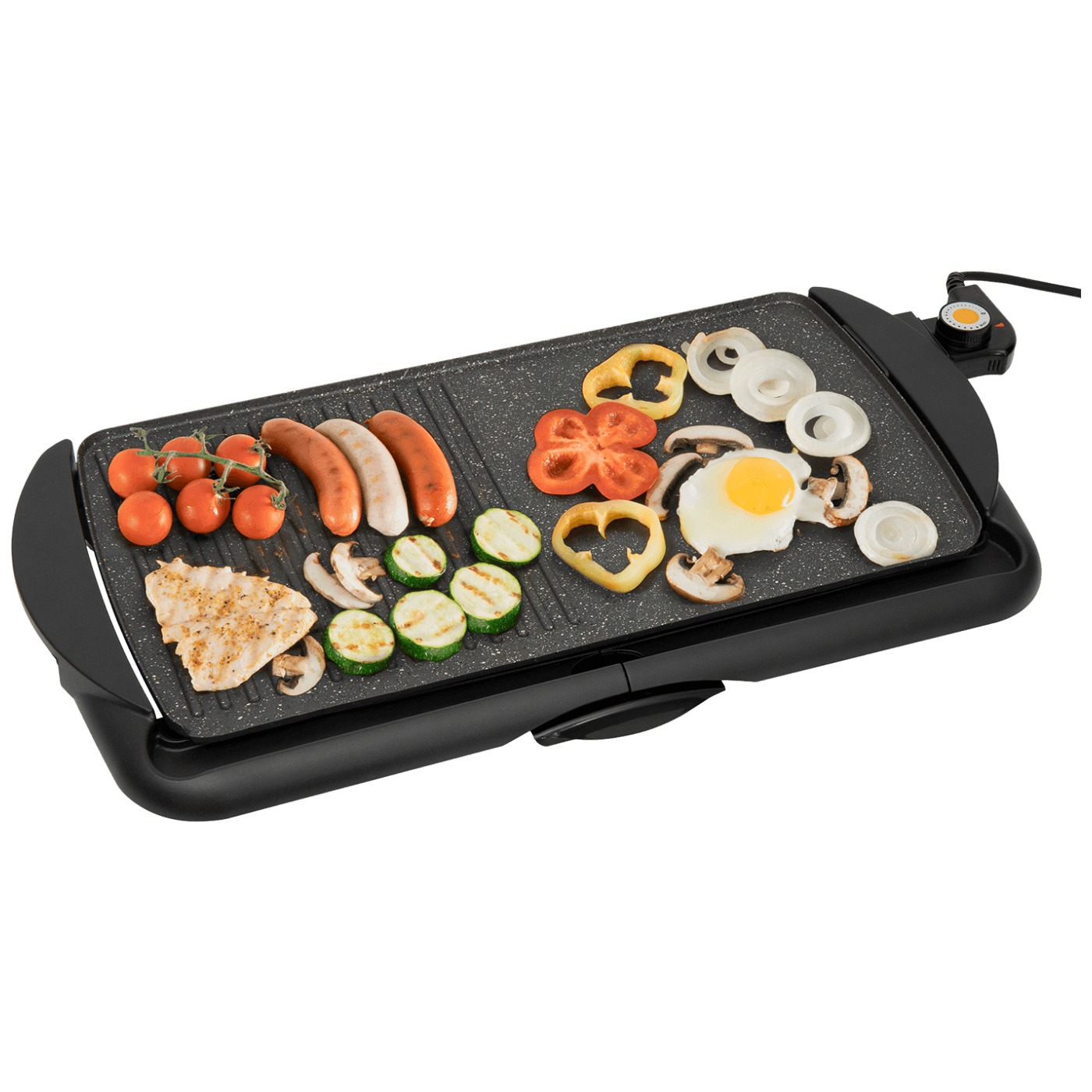 Električni grill, snaga grijača 2000W, grejna površina 52 x 26.5 cm, brzo zagrijavanje, rebrasta i glatka površina sa slojem protiv ljepljenja namirnica, termostat, podesiva temperatura pečenja, odvojiva posuda za skupljanje masnoće, plastične ručke otporne na toplinu, stabilan plastični stalak sa gumenim nogama, jednostavno za održavanje, dužina napojnog kabela 0.8 met., dimenzije 620 x 85 x 32 mm, napajanje 230 V ~ / 50 Hz