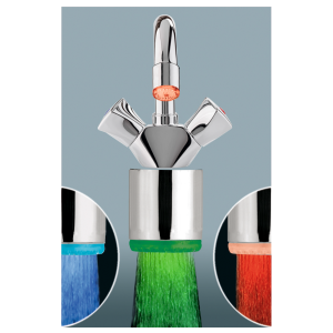 LED senzor temperature, sigurnost za djecu i starije osobe, osvjetljava kupaonicu, automatski se uključuje i isključuje, izvor svjetlosti 1 x RGB LED bez napajanja, dimenzije Ø24 x 32 mm, materijal izrade plastika. Boje: plava – temperatura vode 32°C, zelena 33 – 40°C, crvena 41 – 44°C, treperajuča crvena 45°C