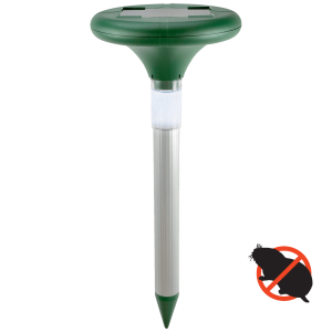 Solarna vrtna LED lampa sa rastjerivačem krtica, solarna ćelija 90 x 60mm, efikasnost do 800m², emisija talasa u intervalima od 50sec, frekvencija 400Hz +/- 100Hz, ugrađena solarna ćelija i punjač za bateriju, zamjenjiva NI-MH baterija 1,2V / 300mAh, izvor svjetlosti LED, materijal izrade plastika / aluminijski stub 250mm