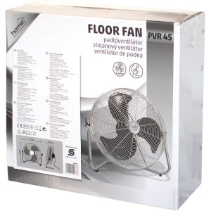 Podni ventilator, promjer lopatica 45 cm, 3 stupnja rada ventilatora koja se mogu prebaciti tipkama, podesiva glava ventilatora, metalne lopatice, metalna zaštitna rešetka, “spreman za upotrebu” ne zahtijeva montažu, napajanje: 230 V ~ / 50 Hz / 95 W