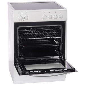 Štednjak sa staklokeramičkom pločom, priključna snaga 8600W 4 grijače zone: – lijevo sprijeda Ø 180mm – 1800W, – desno sprijeda Ø 145mm – 1200W, – lijevo straga Ø145mm – 1200W, – desno straga Ø 180mm – 1800W. Pećnica sa ventilatorom, zapremina 65 lit., dimenzije pećnice 335 x 430 x 390 mm, 8 funkcija, donji i gornji grijač, 1200 / 1100W, grill snage 1400W, unutarnje osvjetljenje, 1 x rešetka, 2 x duboka tava Pretinac za odlaganje Dimenzije aparata 600 x 850 x 600 mm, visina podesiva 2 cm Energetski razred A
