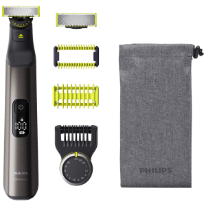 Philips OneBlade Pro Face + Body podrezuje, oblikuje i brije dlačice bilo koje dužine. Sadrži jednu oštricu za lice i jednu sa štitnikom za kožu za dlačice na tijelu. Zaboravite na uporabu više alata. OneBlade radi sve. Philips OneBlade ima revolucionarnu tehnologiju za dotjerivanje dlačica na tijelu. Može brijati bilo koju dužinu dlačica. Njegov dvostruki zaštitni sustav – premaz za bolje klizenje u kombinaciji sa zaobljenim vrhovima – olakšava brijanje te ga čini ugodnijim. Njegova tehnologija brijanja obuhvaća rezač koji se brzo pomiče (12 000x u minuti), tako da je učinkovit čak i na dužim dlačicama. Inovativne oštrice 360 kreću se u svim smjerovima i prilagođavaju se svakoj konturi vašeg lica kako bi održale ugodan dodir s kožom, dok istodobno jamče neprekidnu kontrolu. Jednostavno podrezivanje i brijanje, čak i na najteže dostupnim područjima, uz manje poteza i veću ugodnost. Podrezujte bradu na ravnomjernu dužinu priloženim prilagodljivim preciznim češljem. Odaberite jednu od 14 postavki dužine za postizanje sve od jednodnevne brade do trodnevne ili duže brade. Ergonomska drška za udobno rukovanje, češalj s 14 postavki duljine (0,4 – 10 mm), štitnik za kožu koji se postavlja pritiskom, češalj za dlačice na tijelu koji se postavlja pritiskom Indikator funkcije putnog zaključavanje, vrijeme rada 120 min., vrijeme punjenja 1h, Li-Ion baterija, LED digitalni zaslon Za vlažno i suho korištenje Zamjenska glava QP210, QP220, QP230, QP610, QP620, QP410, QP420