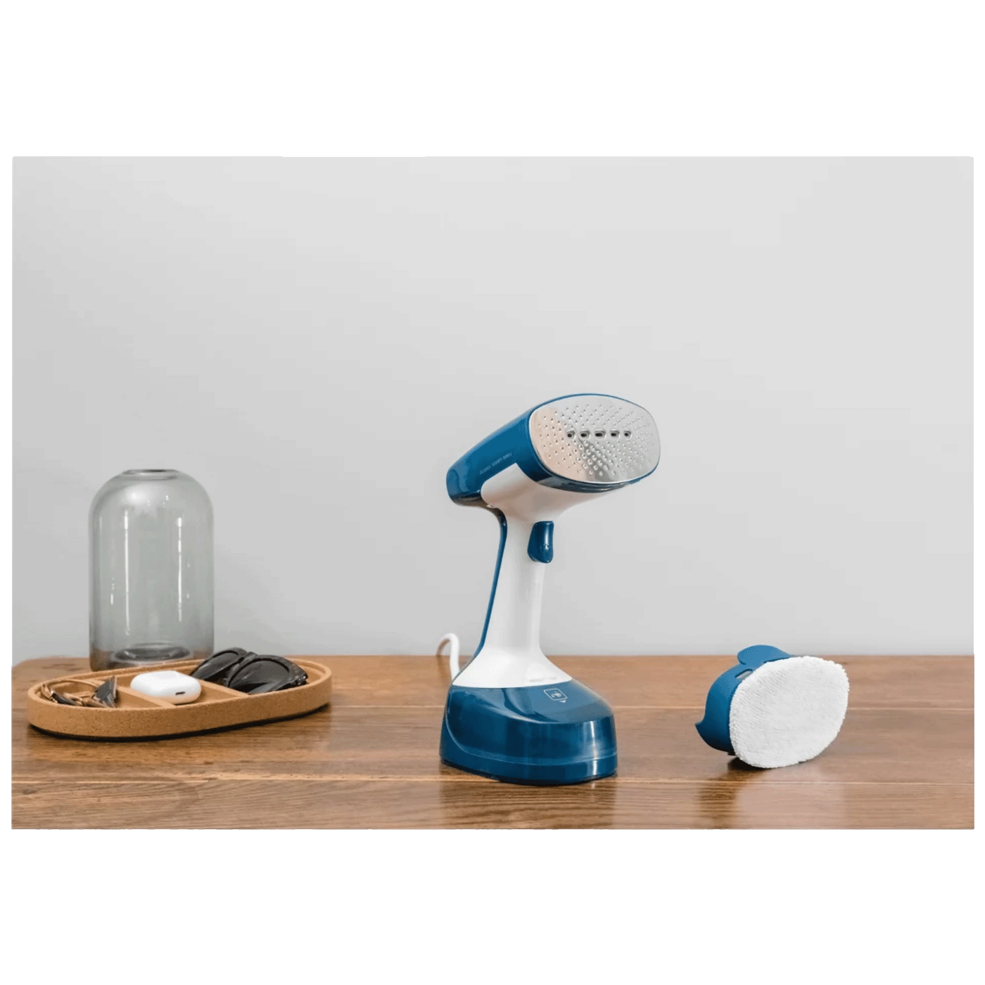 Aparat za vertikalno peglanje jednostavan za upotrebu i dezinfekciju svih vaših odjevnih predmeta Otkrijte Access Steam Easy, ručni aparat za vertikalno peglanje koji brzo uklanja nabore i dezinficira vašu odjeću. Sa snagom od 1.400 W, izlazom pare do 25 g/min i brzim zagrijavanjem od 15 sekundi, ovaj intuitivan aparat za vertikalno peglanje, jednostavan za korištenje, će vas u tren oka pripremiti za izlazak. Potpuno prirodna para za dezinfekciju eliminira do 99,99% virusa i bakterija i smanjuje mirise – dolazi zajedno s nastavkom za dlačice od mikrovlakana za trajnu svježinu. • Snaga: 1400 W • Dodatni udar pare: 25 g/min • Vrijeme zagrijavanja: 15 s • Kapacitet spremnika za vodu: 150 ml • Autonomija: 7 minuta • Dužina kabla: 2.6 m • Boja: Plava / Bijela