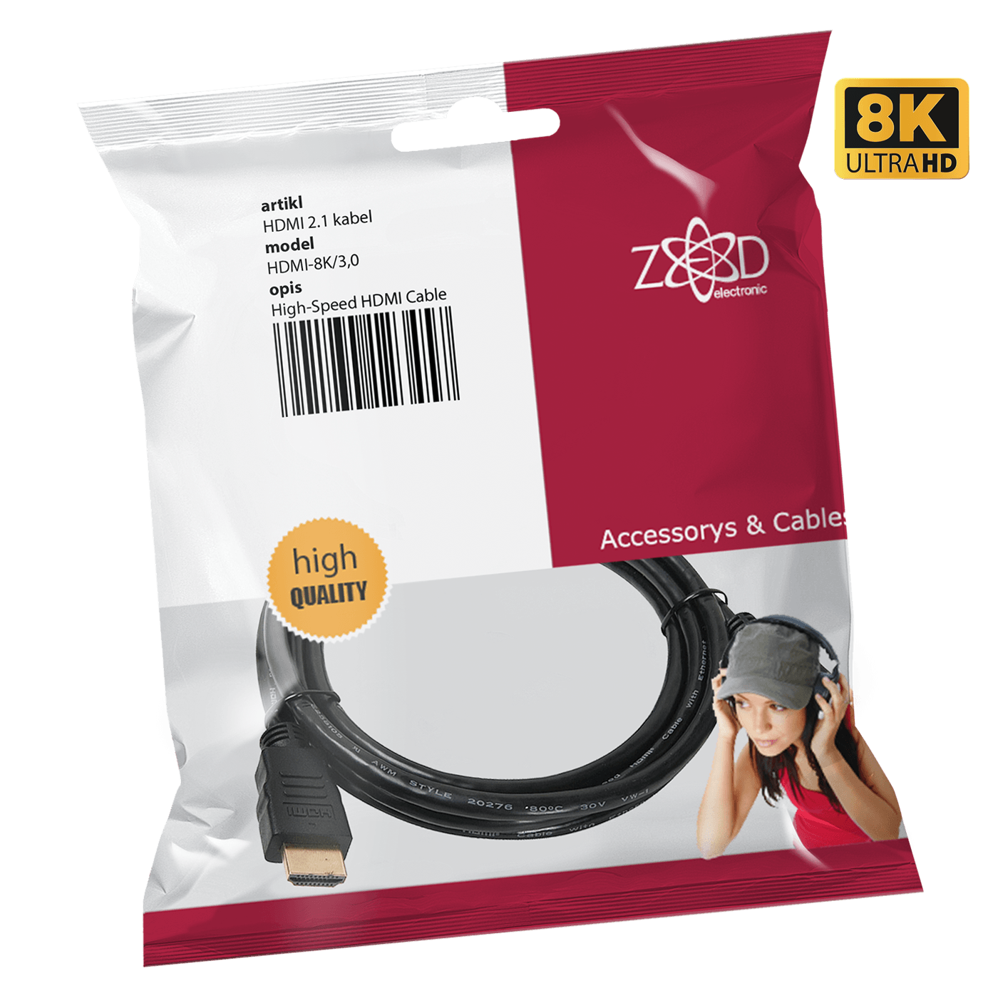 HDMI kabel + Ethernet, ver.2.1, propusnost do 48 Gbps, 10K, 8K@60Hz, 4K@120Hz, UHD, 3D, pozlaćeni konektori, AWG30, Ø 6 mm, dužina 3.0 met.