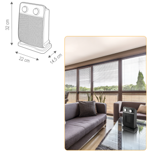 Grijalica sa keramičkim grijačem, 2000 W, DC tihi motor visokih performansi, PTC grijaći elementi, dvije postavke grijanja 1000W / 2000W, zaštita od pregrijavanja, 8 -satni timer, zaštita od prevrtanja, oscilacija, uklonjivi filter čestica prašine, podešavanje temperature 10 – 35 °C, daljinski upravljač
