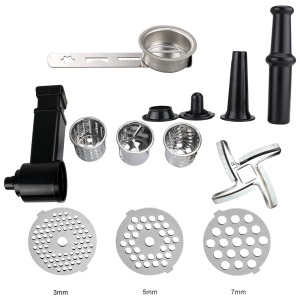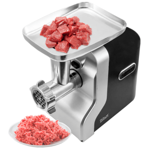 Mašina za mljevenje mesa, 9u1, snaga 2100 W, 3 brzine rada, kapacitet mljevenja 1.8 kg / min., noževi od nehrđajućeg čelika, dodatak za izradu kobasica i kibeh-a, gumene nogice protiv klizanja, 3 diska za rezanje 3 / 5 / 7 mm, potiskivač hrane, rezač za povrče i kolače, metalna četvrtasta ladica za hranu, razina buke 90 dB, napajanje 220 – 240 V / 50 – 60 Hz